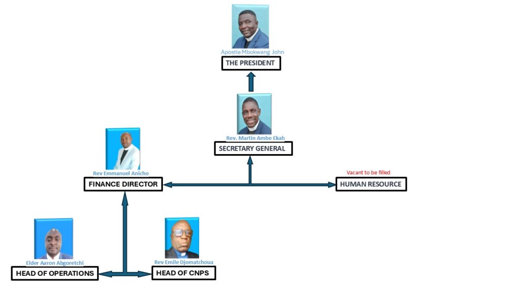 Apostle Dr. Sunday M. Mbote is the President of the Apostolic Church Cameroon both in the nation Cameroon and Abroad. He is the Cheif Executive Officer of TACC, the chairman of the Executive and National Council. He takes executive decisions in collaboration with the National Council on trivial matters that affects the growth and wellbeing of the Church. He stands as the Lead Pastor of the Church and oversees the spiritual and physical(financial, infrastructural, and Social) development of the church.